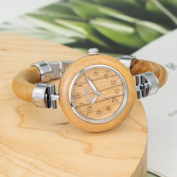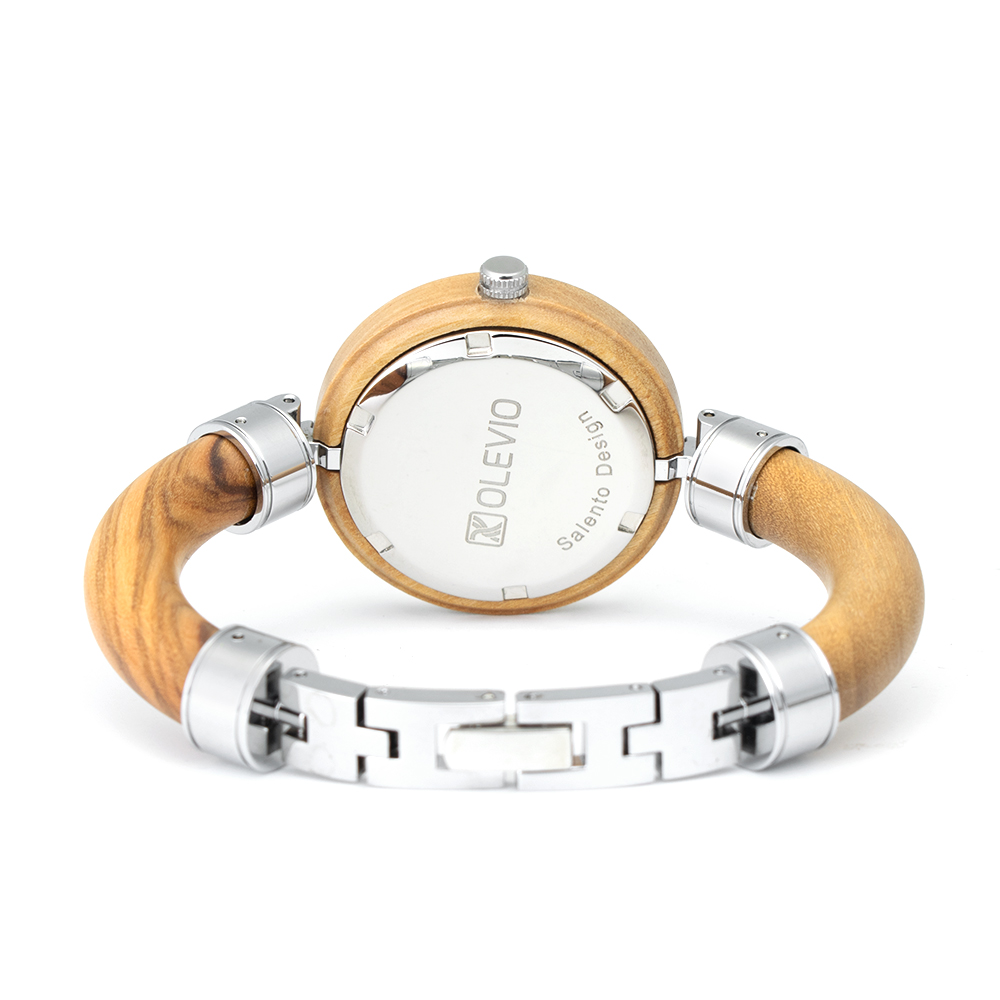 Vega è un orologio prettamente femminile, è dotato di una scocca in legno d’olivo da 35 mm con elementi in acciaio che donano un aspetto davvero elegante.